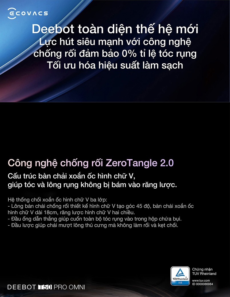 Công nghệ ZeroTangle 2.0 là một bước đột phá trong thiết kế bàn chải của robot hút bụi. Thay vì sử dụng các loại bàn chải truyền thống dễ bị rối tóc, ZeroTangle 2.0 sử dụng cấu trúc hình chữ V ba lớp độc đáo giúp robot hút bụi Deebot T50 Pro Omni làm sạch mọi loại bề mặt sàn gỗ, gạch men, thảm… kể cả những sợi tóc dài.