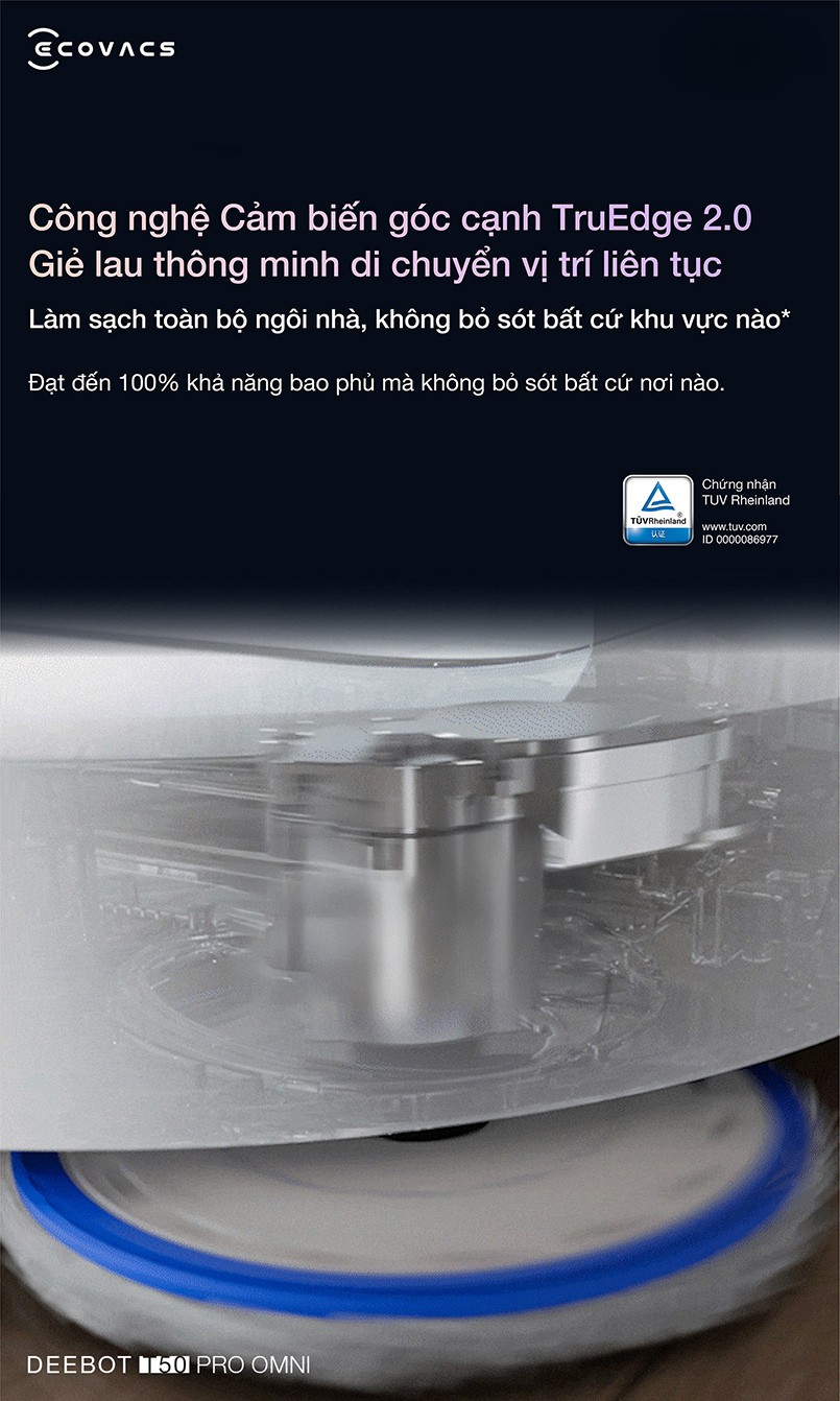 Robot hút bụi lau nhà Ecovacs T50 Pro Omni được ứng dụng thêm công nghệ làm sạch cạnh TruEdge 2.0. Từ đó làm sạch hiệu quả các góc cạnh, kẽ hở, những nơi mà các loại chổi thông thường khó lòng chạm đến được. Chổi bên hông linh hoạt, giúp robot dễ dàng tiếp cận, lau dọn các góc tường, chân tường, dưới gầm bàn ghế…giúp ngôi nhà luôn sạch bong.